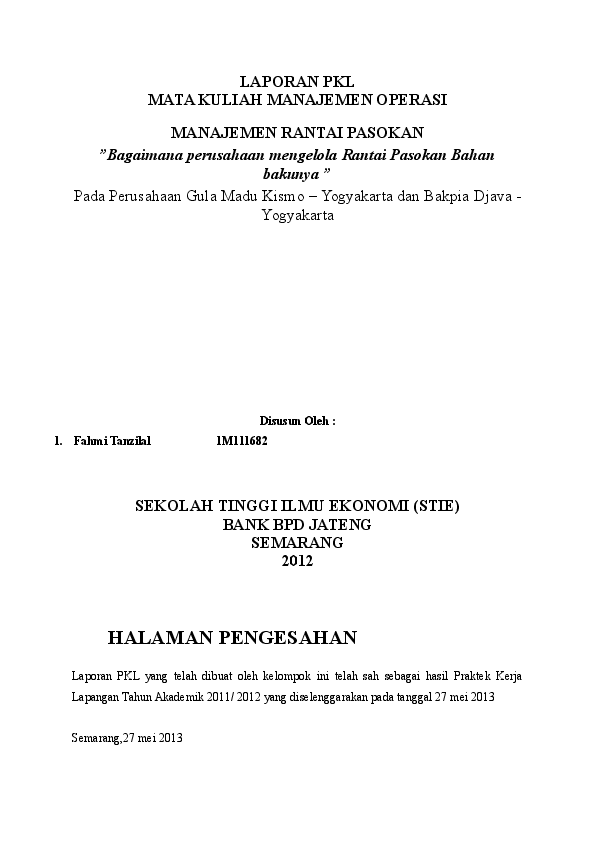Praktik Kerja Industri Prakerin atau yang juga dikenal dengan PKL kepanjangan dari. Oh ya kali ini saya hanya akan memberikan gambarannya saja tapi tenang saya juga akan memberikan file soft copy laporan PKL yang sudah saya siapkan untuk dijadikan contoh dalam penyusunan laporan PKL. LOMBOK GANDARIA KARANGANYAR PRAKTEK KERJA LAPANGAN Disusun untuk memenuhi salah satu syarat dalam Menyelesaikan Program Pendidikan Sebagai Ahli Madya Farmasi dan Makanan DISUSUN OLEH.