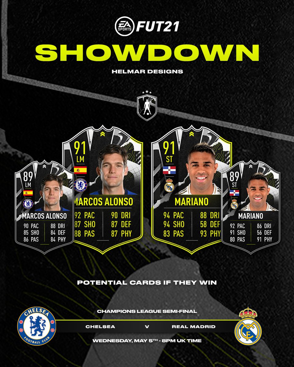 EA has dropped two brand new Showdown SBC cards ahead of the UCL semi-final second leg between Chelsea and Real Madrid in FIFA 21 Ultimate Team. Join the discussion or compare with others. Thiago Silva 85 Cesar Azpilicueta 83 Ben Chilwell 81 Antonio Rudiger 81 Kurt Zouma 81 Reece James 80 Marcos Alonso.